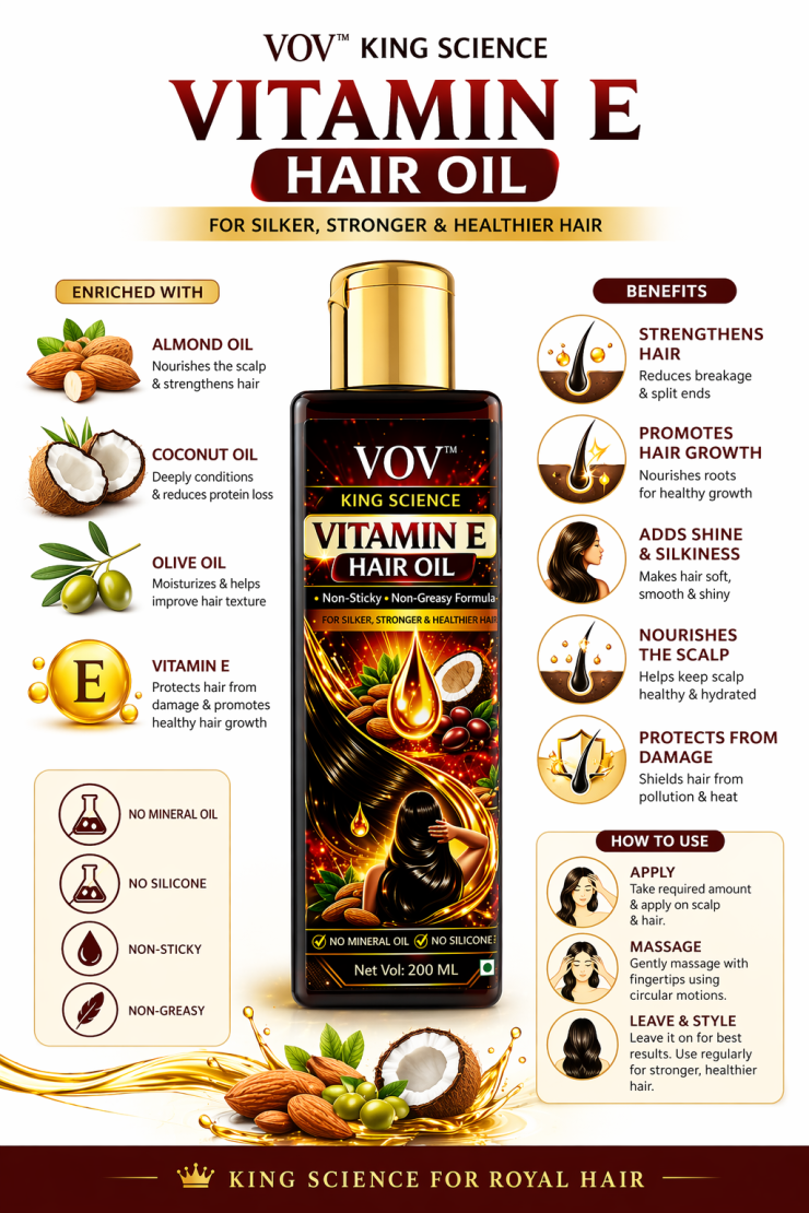 Key Benefits Strengthens Hair Roots – Helps reduce hair fall and breakage Promotes Hair Growth – Nourishes scalp for healthier, faster growth Deep Nourishment – Repairs dry and damaged hair Adds Shine & Silkiness – Makes hair smooth, soft & glossy Controls Frizz – Improves manageability Protects from Damage – Shields hair from pollution & heat Non-Sticky & Lightweight – Ideal for regular use No Mineral Oil, No Silicone – Safe and clean formulation 🌿 Hero Ingredients (Optional Section) Vitamin E – Protects & promotes healthy hair Almond Oil – Strengthens and nourishes Coconut Oil – Deep conditioning & repair Olive Oil – Adds moisture & smoothness