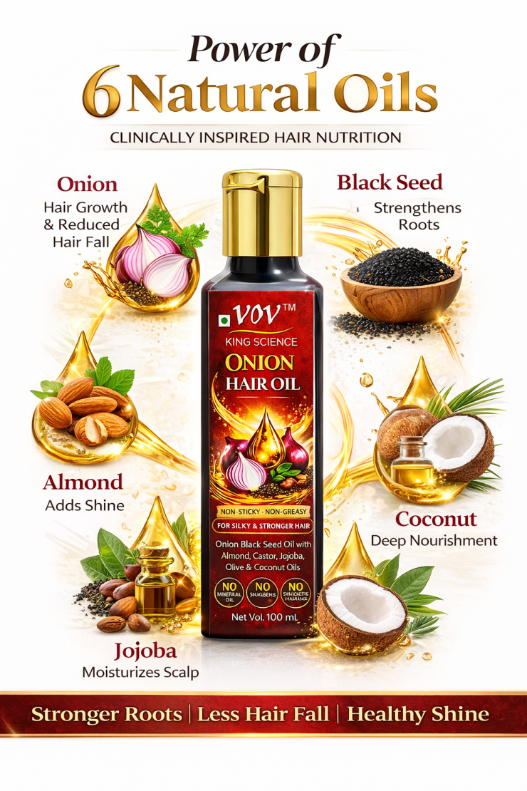 Key Benefits of VOV™ Onion Hair Oil Reduces Hair Fall: Helps strengthen hair roots and minimize breakage for healthier hair. Promotes Hair Growth: Enriched with onion and black seed oil to support thicker, fuller hair. Strengthens Roots: Improves scalp health and nourishes hair from root to tip. Deep Nourishment: Blend of almond, castor, jojoba & coconut oils hydrates and repairs dry hair. Adds Shine & Smoothness: Enhances natural shine while reducing frizz and roughness. Non-Sticky & Lightweight: Quick-absorbing formula suitable for daily use without greasy feel. Improves Hair Texture: Makes hair softer, smoother, and more manageable. Safe & Clean Formula: Free from mineral oil, silicones, and synthetic fragrance. Suitable for All Hair Types: Ideal for men and women with dry, damaged, or normal hair