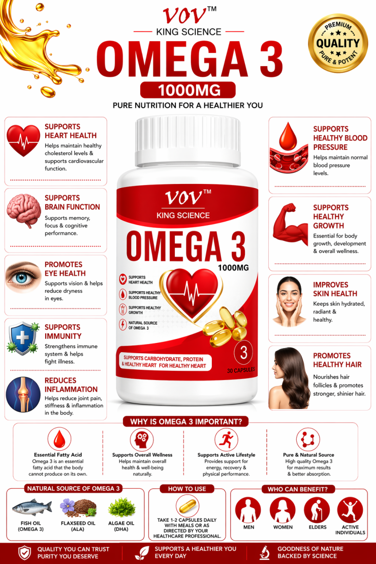 Key Benefits 🌱 100% Vegetarian Omega 3 Derived from algal oil, perfect for veg lifestyle ❤️ Supports Heart Health Helps maintain healthy cholesterol levels 🧠 Boosts Brain Function Improves memory, focus, and cognitive performance 👁️ Supports Eye Health Promotes vision and reduces dryness 🦴 Supports Joint Health Improves flexibility and reduces stiffness 🔥 Reduces Inflammation Helps ease joint discomfort ✨ Improves Skin & Hair Supports hydration and healthy appearance 🌍 No Fish Oil, No Fishy Burps Clean, plant-based alternative